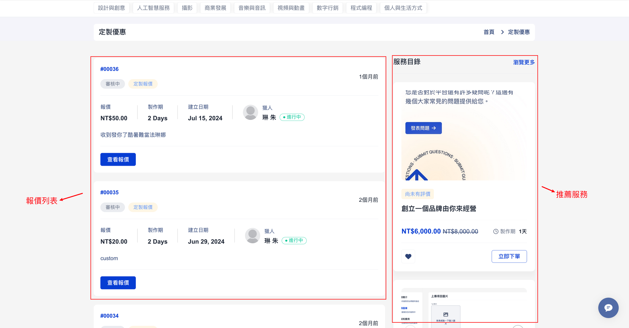 - 推薦服務:此欄是根據買家以往任務類型,推薦給買家的賣家相似服務。買家可以選擇服務並下單。