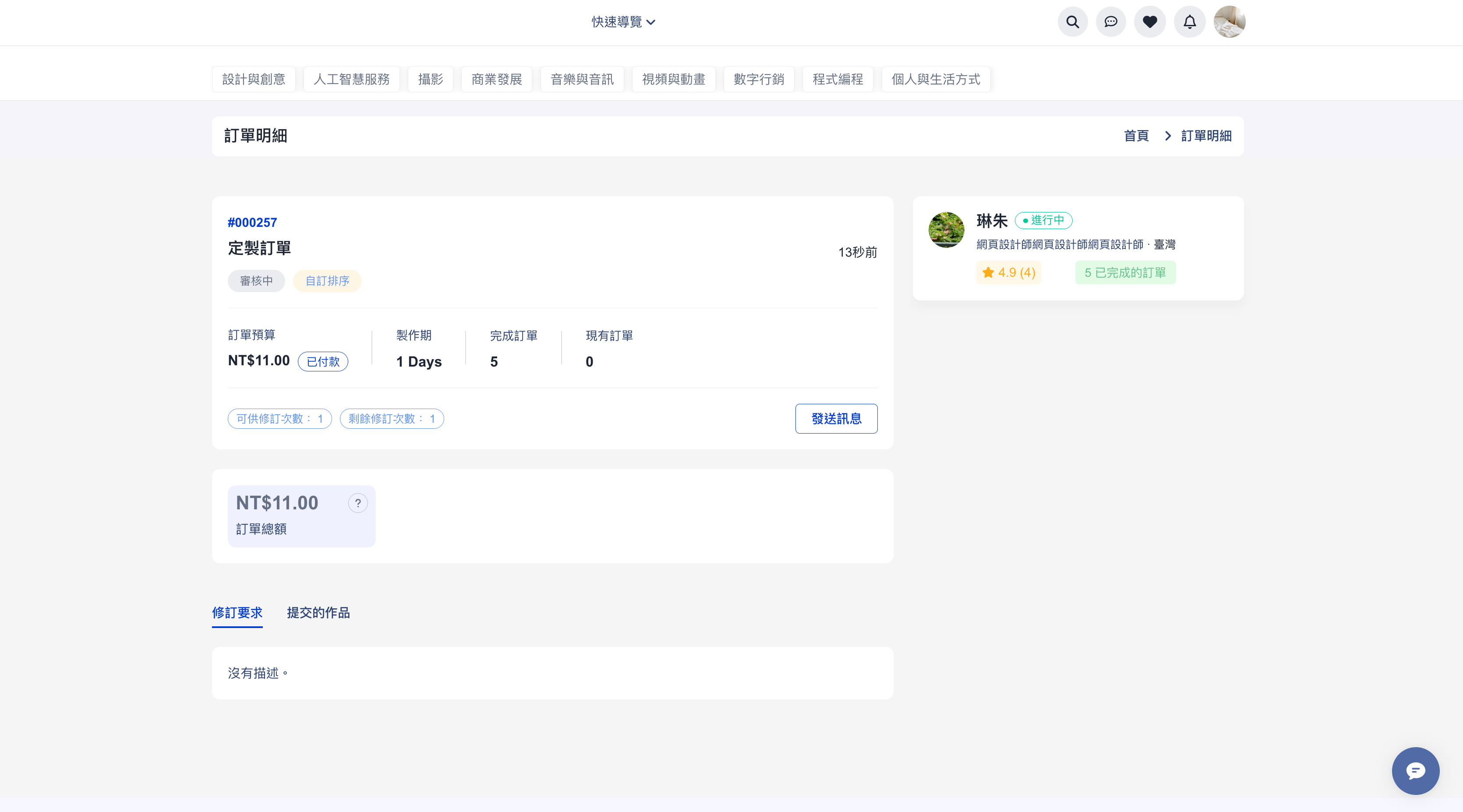 - 賣家資訊:展示買家的主要資訊,如買家名稱、技能、評分、已完成訂單數量等。