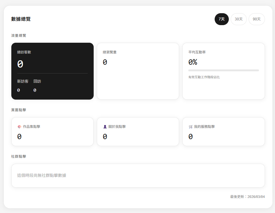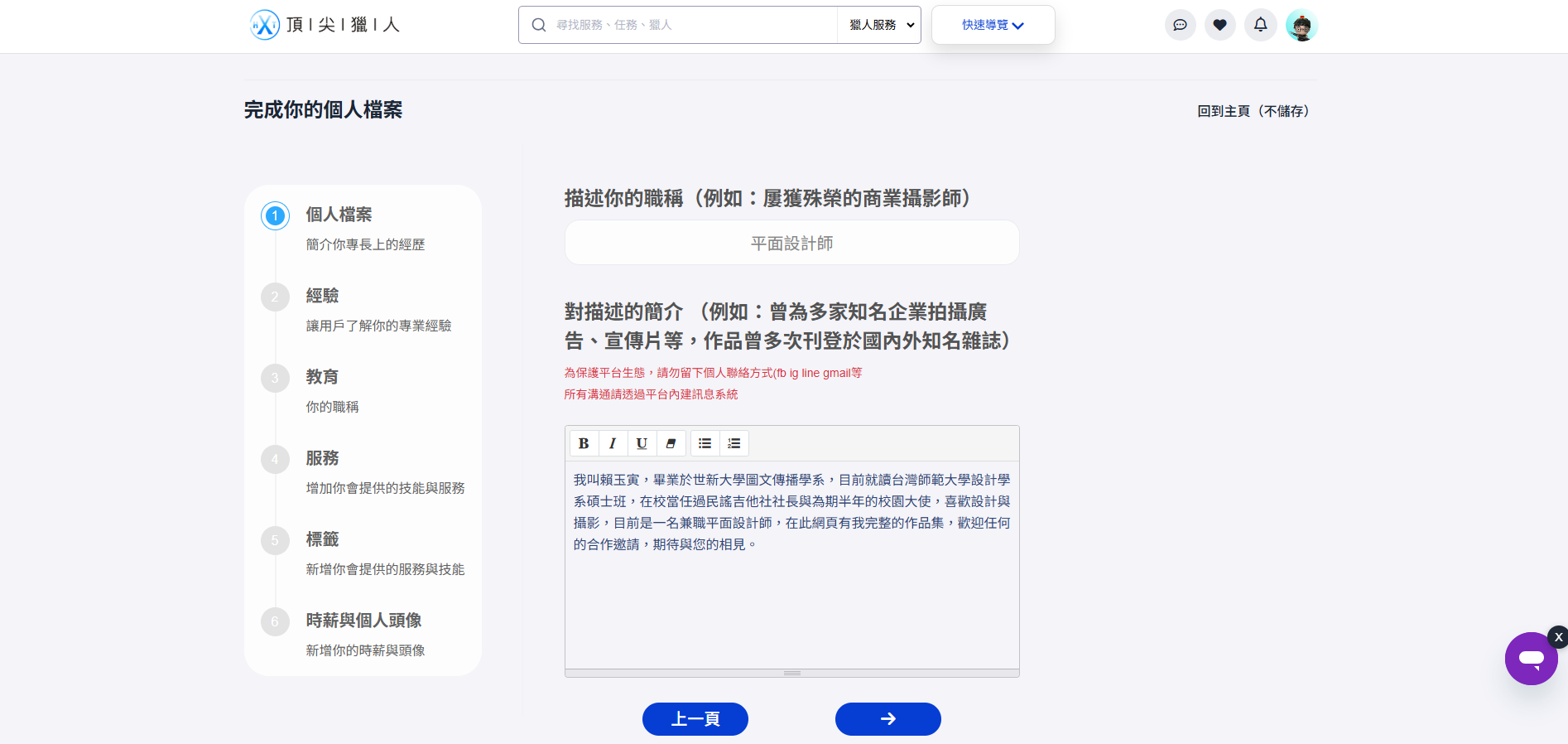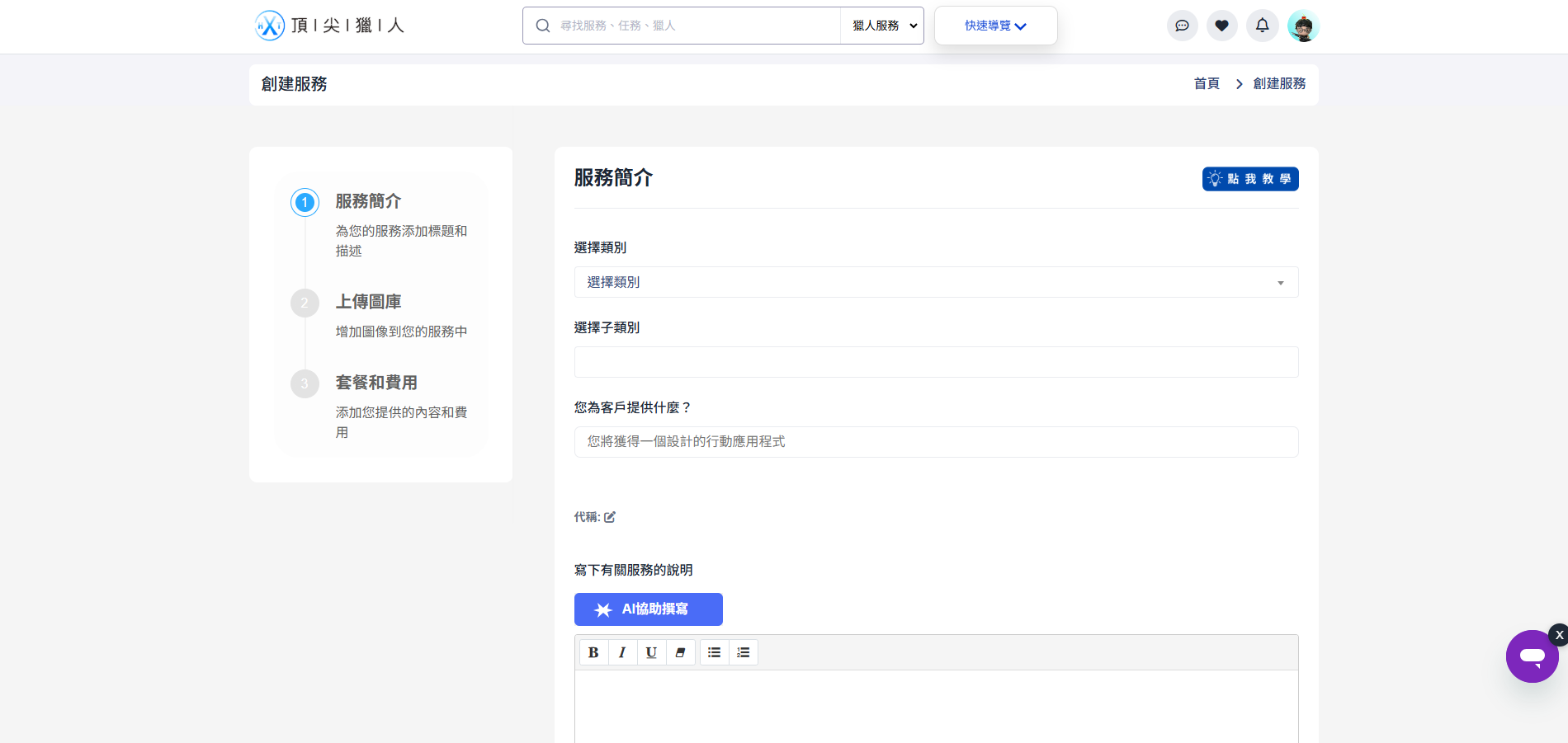 如何使用服務名片 頂尖獵人幫助中心 2026年03月06日 09:06 更新於 首先完成個人簡歷設置完成個人資料填寫創建個人服務/並通過服務審核最後在服務總覽新增外部網站連結完成上述資料後,在服務名片頁面將自動帶入您的資料,您可以在此頁面編輯樣板/背景顏色/背景遮罩也可以在此頁面觀看流量數據 相關文章 AI 影音面試分析 :賣家凸顯實力的助手 評論 0 條評論 請登入寫評論。